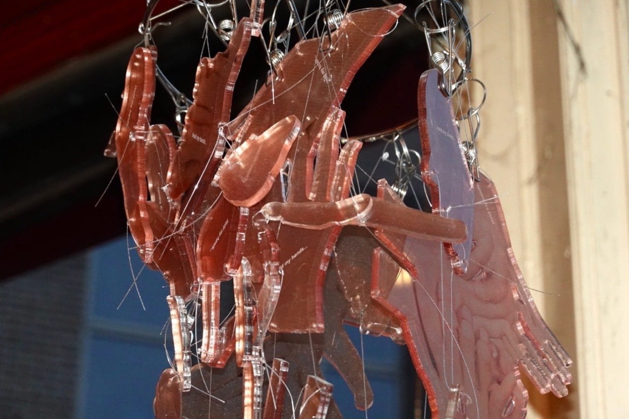 Details of the kinetic sculpture with deformed hands displayed in Farce group show