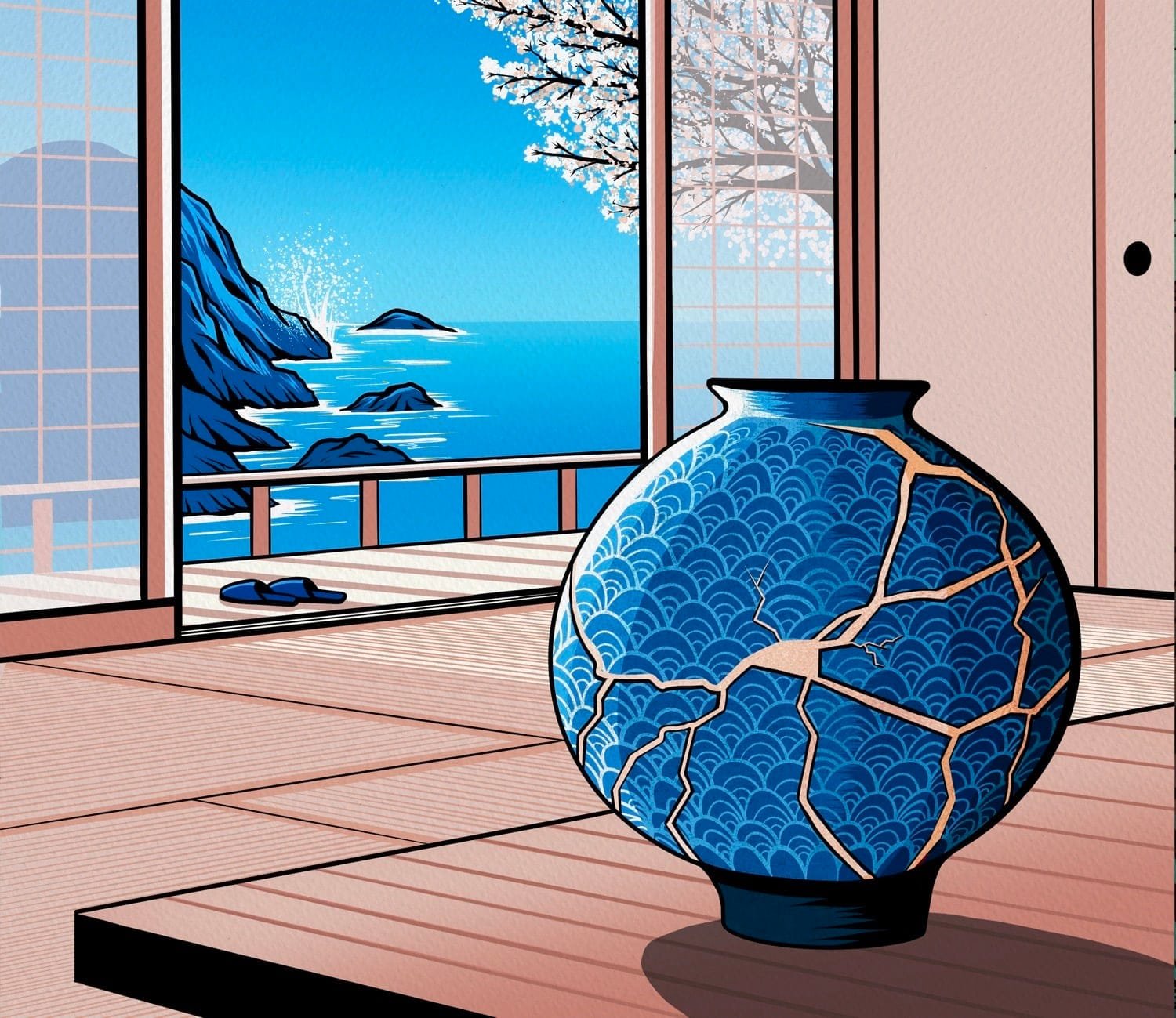My time in Kanazawa had a big influence on the development of the exhibition. The city has a rich artistic heritage, particularly in gold leaf, which I incorporated into one of the pieces. I was inspired by the concept of Kintsugi, the Japanese art of repairing broken pottery with gold, transforming something damaged into something new and beautiful. It felt like the perfect metaphor for the charity print I created to raise funds for Noto, a region still recovering from the earthquake.